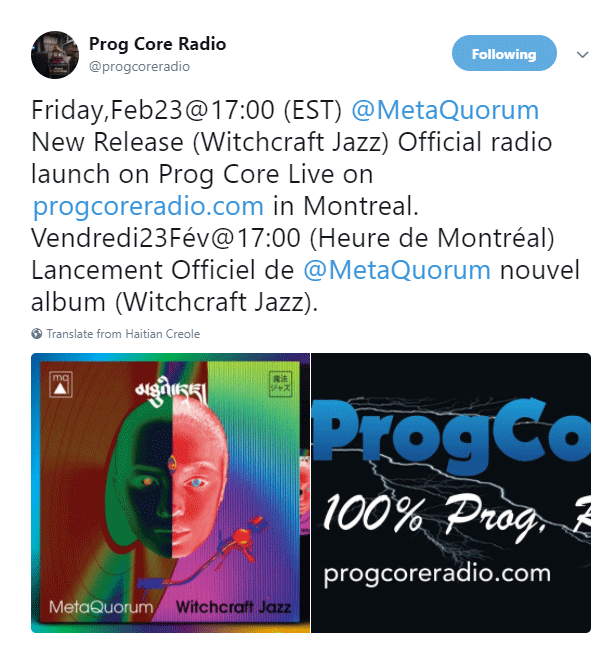 Tomorrow WITCHCRAFT JAZZ has its very own radio launch with Denis Champagne at Prog Core Radio