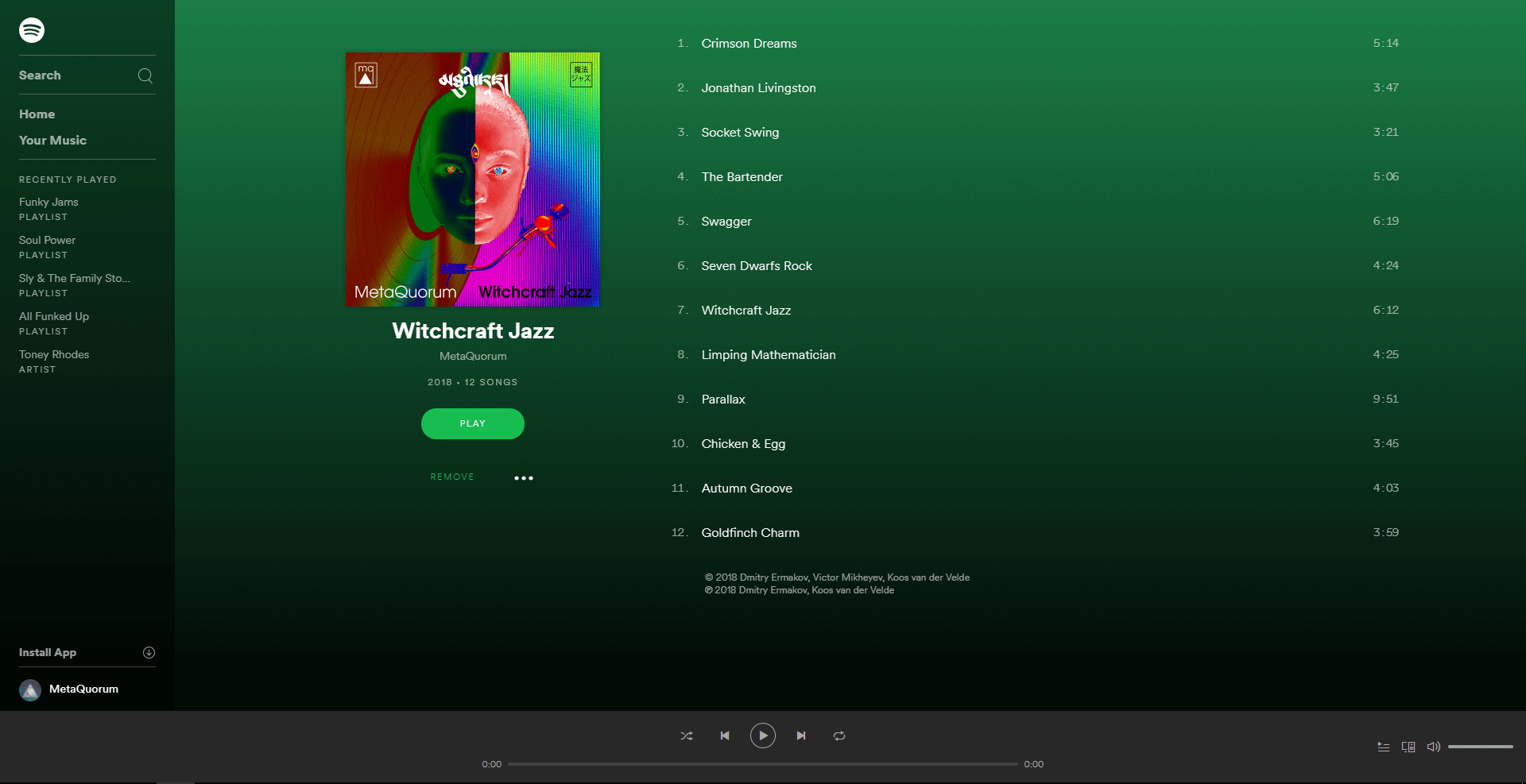 In terms of style, this album flows organically from MetaQuorum’s previous compositions, further developing the concept of Meld music, a fusion of Prog,Funk, Jazz, Rock, Swing, Electronica and more. Compositions such as the title track Witchcraft Jazz, Parallax, Limping Mathematician and Autumn Groove further explore the technique of Structural Fusion. The coda – Goldfinch Charm – is an exquisite blend of Electronica with Jazz Fusion and Blues, while the opening track – Crimson Dreams – includes a lyric poem written and read by Dmitry Ermakov.